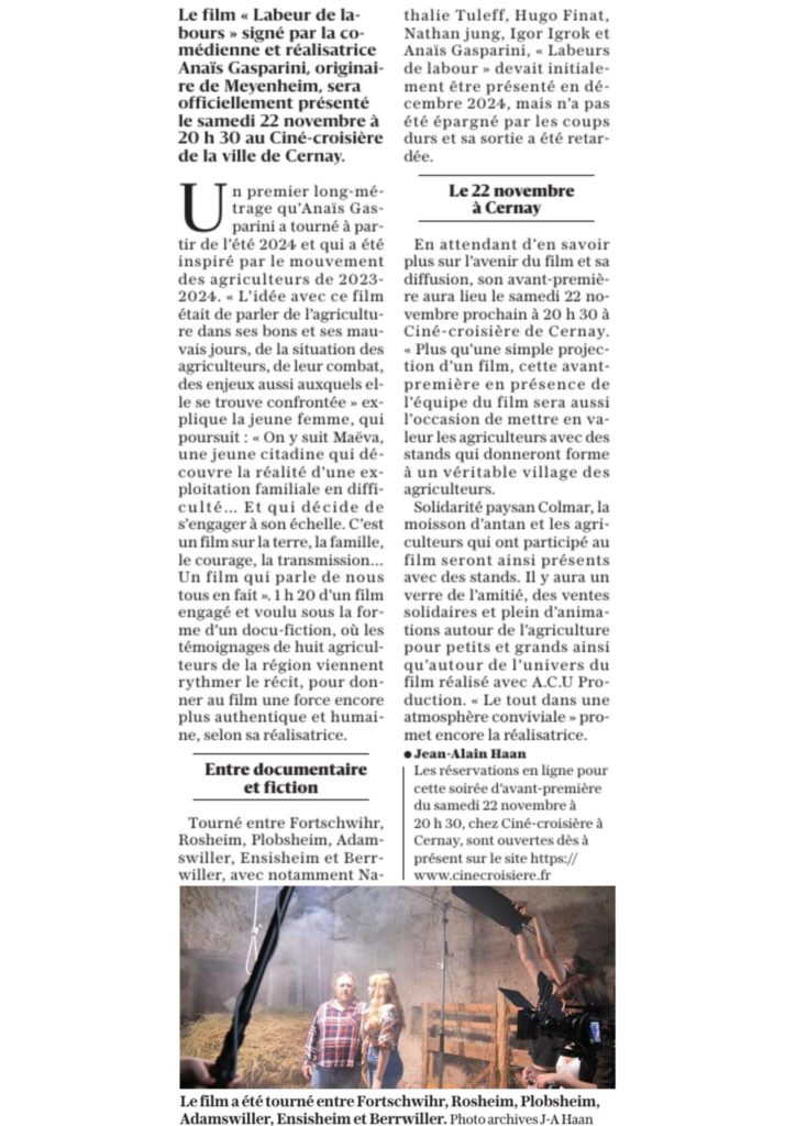 L’antenne locale de Colmar de « Solidarité paysan » est également devenue partenaire du projet. Défendant des valeurs communes, ils nous livreront des témoignages exclusifs en lien avec la fiction en interaction avec l’un des personnages principal du film. Une scène où fiction et réalité se mélangent, à l’image de la docu-fiction « Labeur de labours » où des témoignages de vrais agriculteurs se mêlent à la fiction de ce scénario au style téléfilm.
