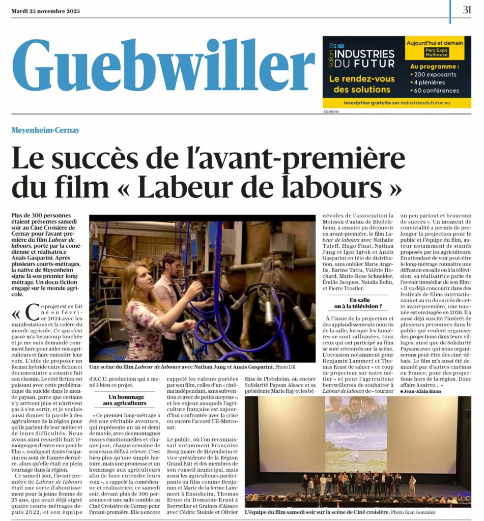 Le long-métrage Labeur de labours, réalisé par Anaïs Gasparini, est sorti en avant-première le samedi 22 novembre 2025 à 20h30 au Ciné-Croisière. Ce docu-fiction tourné en Alsace donne la parole à huit agriculteurs et met en lumière leurs réalités, leurs valeurs et leur passion du métier.